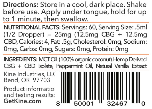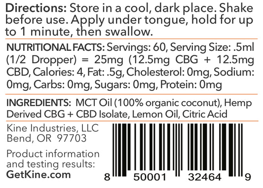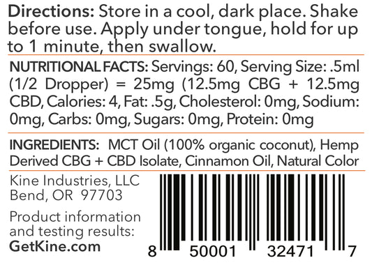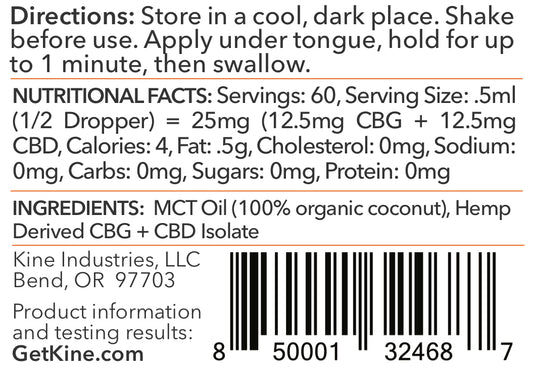 For optimal results with Kine's CBD/CBG tincture, start with a smaller dose, taken once or twice daily. Our calibrated glass dropper ensures precise measurement. Gradually increase the dosage until you reach the desired effect. It's best to take the tincture sublingually, by placing the dose under the tongue for 30 seconds to one minute before swallowing, to enhance absorption. Always consult with a healthcare professional to tailor the dosage to your specific needs, especially if you're currently on other medications.